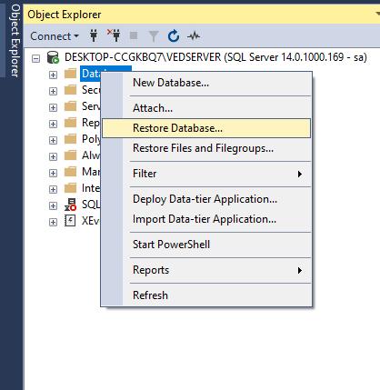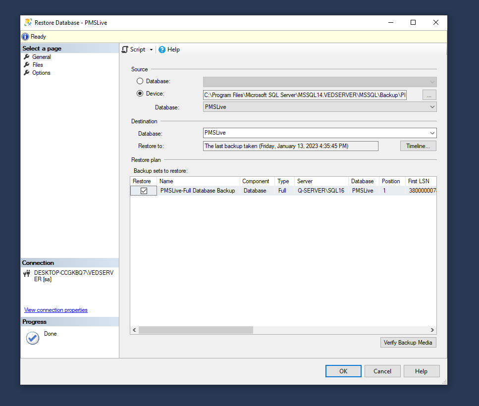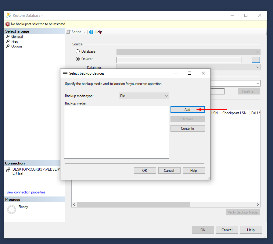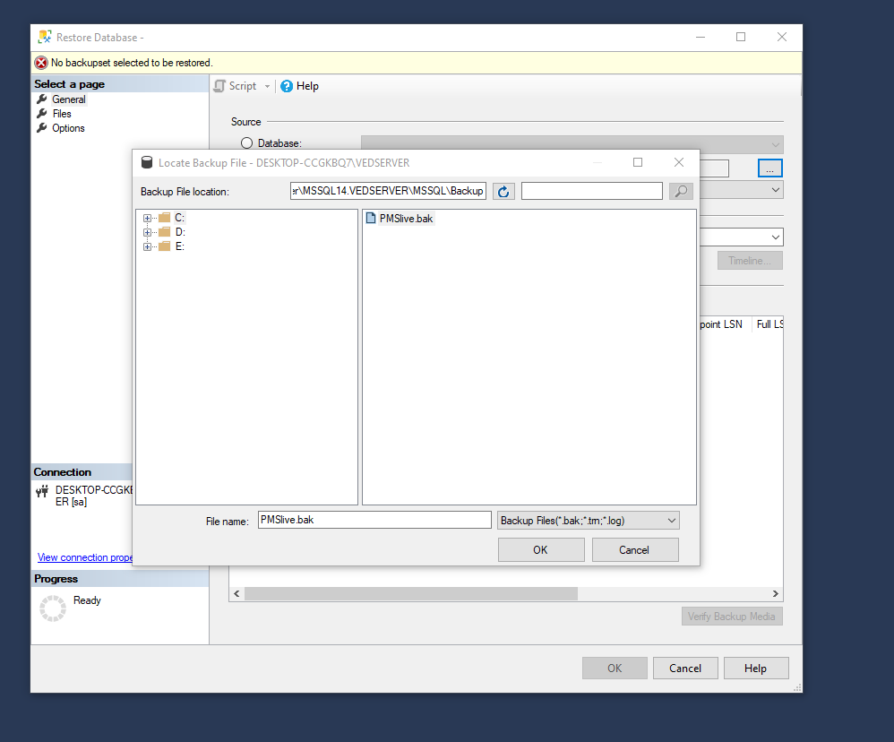 .bakfile is located. Select the.bakfile and then select OK. - Select OK to close the Select backup devices dialog box.
