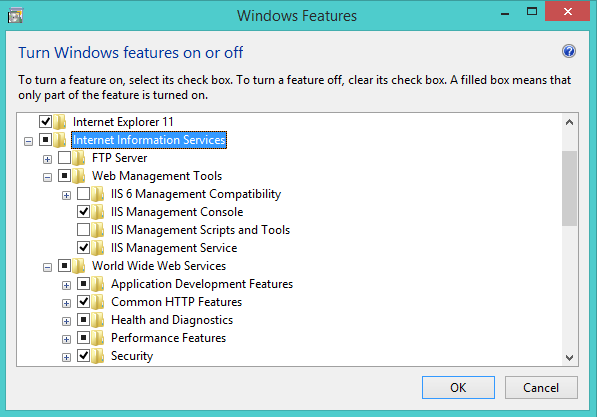 - You will get a list of Windows features. Expand the Internet Information Service option. Select all required features to add to your IIS server. Now click OK.